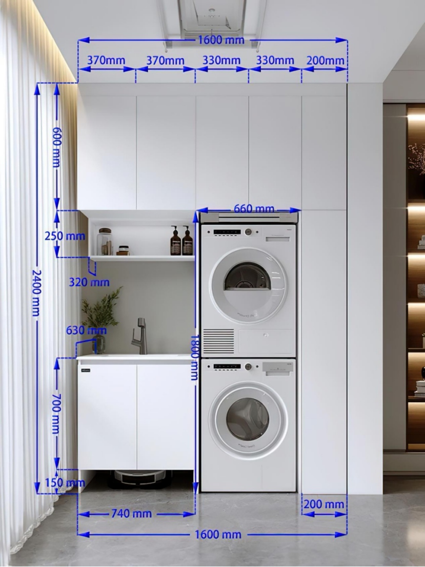 (1) Integrated Storage: The design integrates the washing machine (stacked), sink, and cabinets. Upper wall cabinets, side cabinets, and lower base cabinets provide layered storage for laundry supplies and cleaning tools. Bottom storage baskets can organize dirty clothes and miscellaneous items, maximizing space utilization.