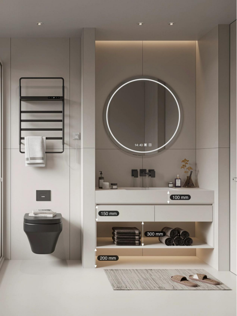This bathroom vanity is made of multi-layer solid wood with a moisture-proof surface treatment, ensuring its durability. It features a smart round mirror with LED lights, providing both time display and supplemental lighting. The cabinet combines drawers and open shelves with precise 150mm and 300mm partition dimensions to meet various storage needs, while the 200mm overhang at the bottom facilitates cleaning, achieving a balance between aesthetics and practicality.