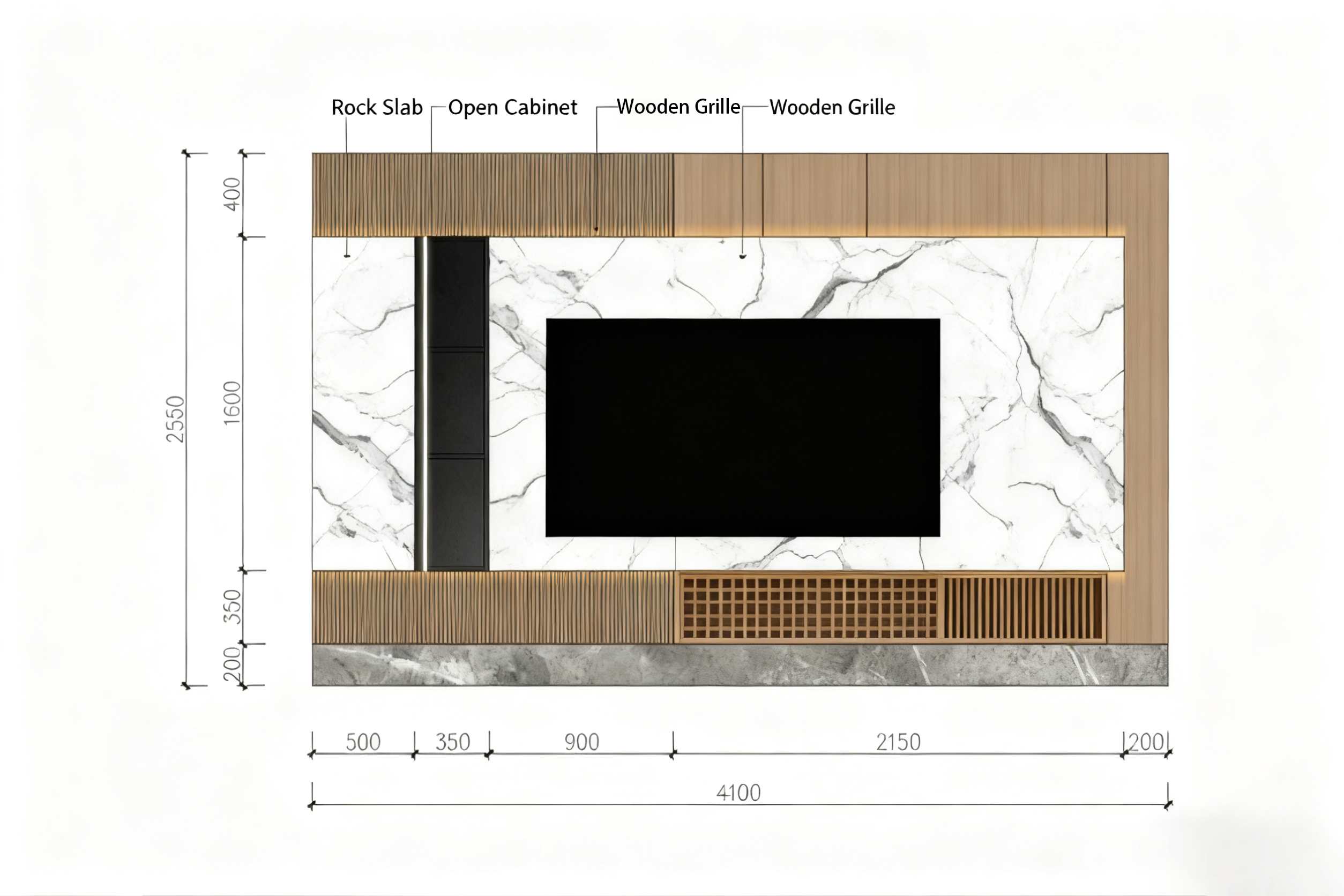 Size selection needs to consider both the room size and the TV's specifications. In terms of length, a 1.5-2 meter TV stand is suitable for small living rooms, 2-2.5 meters for medium-sized living rooms, and over 2.5 meters for large living rooms, or even a custom-made full-wall stand. The TV stand should be at least 20 centimeters longer than the TV, and TVs larger than 75 inches require an even longer stand. The height is usually 40-60 centimeters, ideally with your eyes level with the center line of the TV when seated on a sofa. The depth is generally 40-60 centimeters, but for custom-made stands, a depth of around 55 centimeters is recommended. Leave a 10-centimeter gap around the TV area for ventilation.