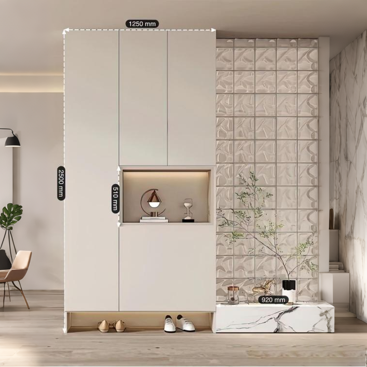 (1) Layered Storage: The overall height is 2500mm and width is 1250mm. The large upper cabinet accommodates ample storage for shoes and miscellaneous items; the 510mm high open display area in the middle can hold decorative ornaments or frequently used small items, combining aesthetics and practicality.