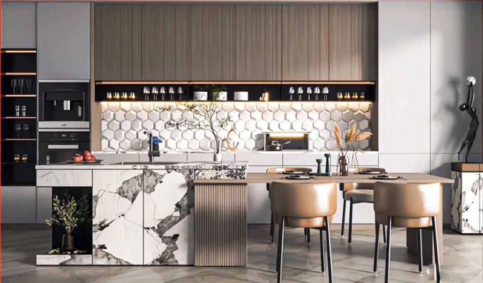 Multi-layer solid wood sideboards are preferred (moisture-resistant and stable) and solid wood (environmentally friendly and high-end). For door panels, options include soft-touch boards (delicate feel), glass (transparent and textured), and solid wood (versatile style), depending on the kitchen's humidity and overall decor.
