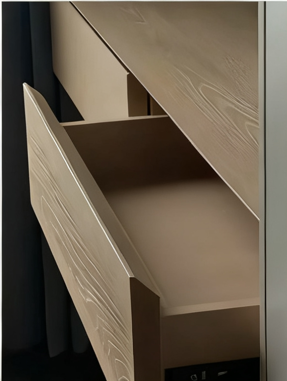 This is a modern minimalist style employee break room cabinet, featuring a light wood and white color scheme and a simple yet sophisticated design. The cabinets are cleverly integrated with the island counter, providing ample storage space for coffee equipment, snacks, and drinks. Paired with simple white wall cabinets, it harmonizes with the natural wood elements and black and white furniture in the space, improving the break room's storage efficiency while creating a comfortable and tidy environment for employees to relax and enjoy light meals. It's a practical and aesthetically pleasing choice for creating a modern office break space.