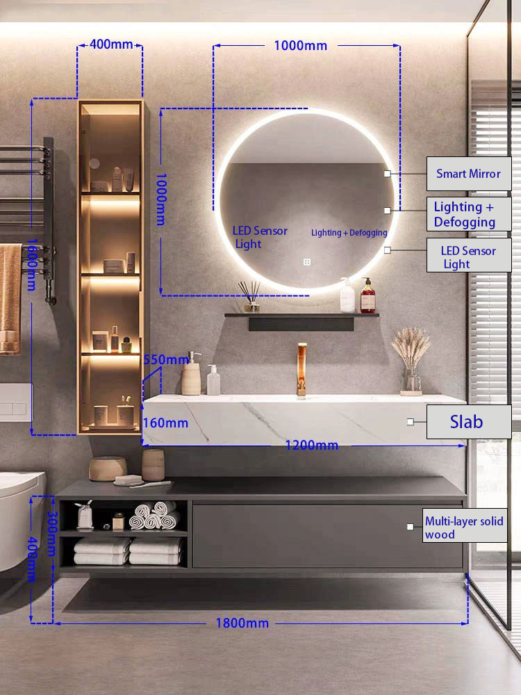 This bathroom vanity features a solid wood cabinet with a delicate textured finish, paired with a slab countertop for durability. A gold-plated glass shelf on the left side with tiered lighting offers convenient storage and display. The main cabinet combines open shelves and drawers to meet diverse storage needs. A smart round mirror with LED lighting provides both illumination and aesthetic appeal. The overall design blends craftsmanship and practicality, creating a subtly luxurious bathroom space.
